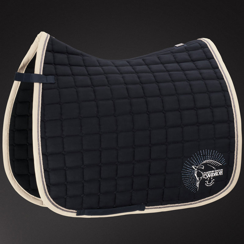 Exklusive, gesteppte Schabracke mit kontrastfarbener Paspelierung und einer Eskadron-Applikation aus Strasssteinen. Der Bezug ist anatomisch geformt und hat ein feuchtigkeitsregulierendes Futter.