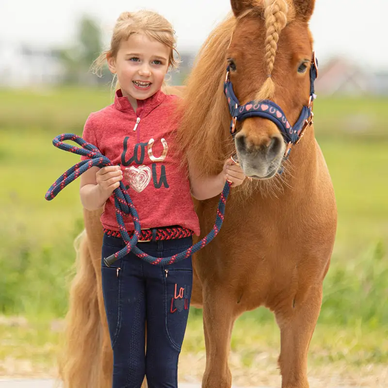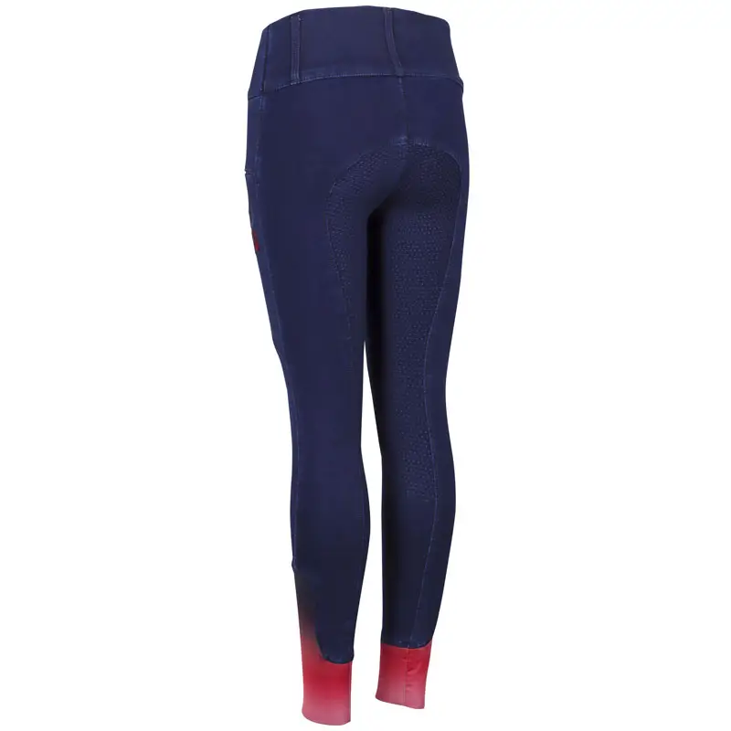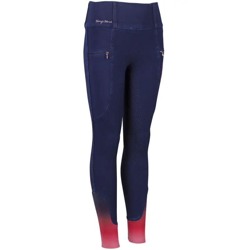 Harry's Horse Equitights LouLou Denim Kids Dress-Blues aus einem sehr elastischen Stoff mit breitem Bund mit Gürtelschlaufen und Reißverschlusstaschen. Der elastische Teil an den Knöcheln ist in einer Kontrastfarbe gehalten und die Reitleggings ist mit einem Silikonbesatz versehen.