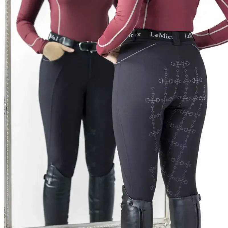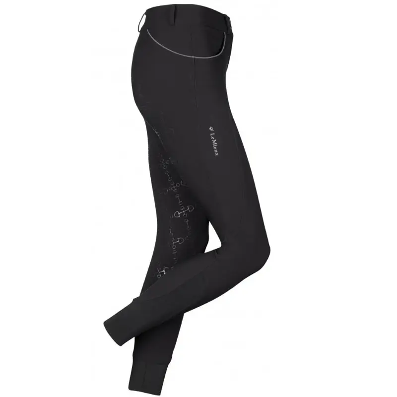 Die LeMieux Reithose Freya schwarz ist eine bequeme Damenreithose aus strapazierfähigem Stretchmaterial. Diese Reithose ist an der Beininnenseite und am Gesäß nahtlos und hat einen hohen Bund mit Silikon-Grip-Besatz. Die Reithose ist mit Taschen in Kombination mit kontrastierenden Paspeln versehen, hinten teilweise durchgehend und hat einen Lycra-Verschluss an den Knöcheln.