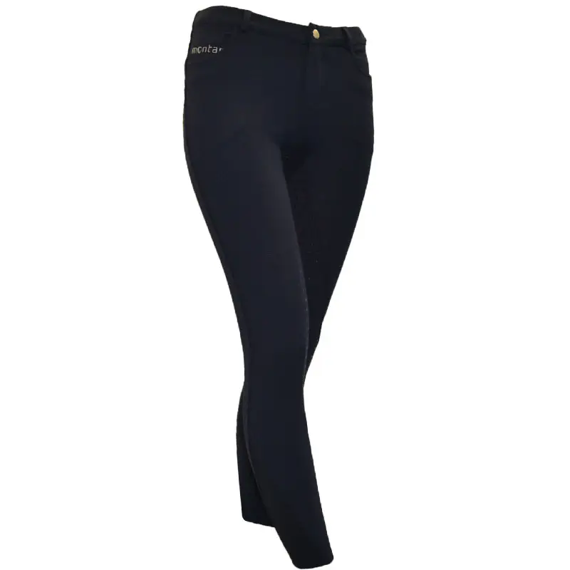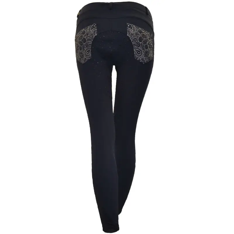 Die Kinderreithose Silver der Marke Montar ist eine Reithose, die vorne und hinten mit Jeanstaschen ausgestattet ist. Die Reithose ist mit einem Silikonbesatz, einem elastischen Teil an den Knöcheln und gestickten Applikationen ausgestattet.