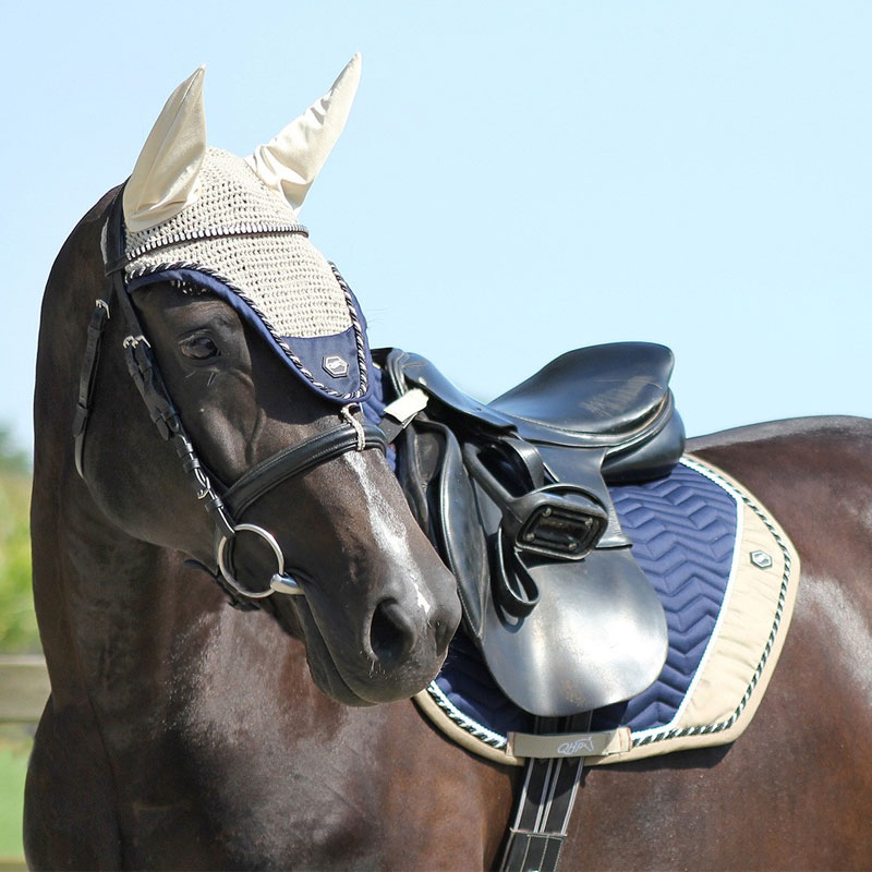 Gehäkeltes Ohrnetz langes Modell der Marke QHP mit elastischen Lycra-Ohren. Das Ohrnetz ist in Denim-Optik mit QHP-Badge und dekorativer Kordel ausgeführt.