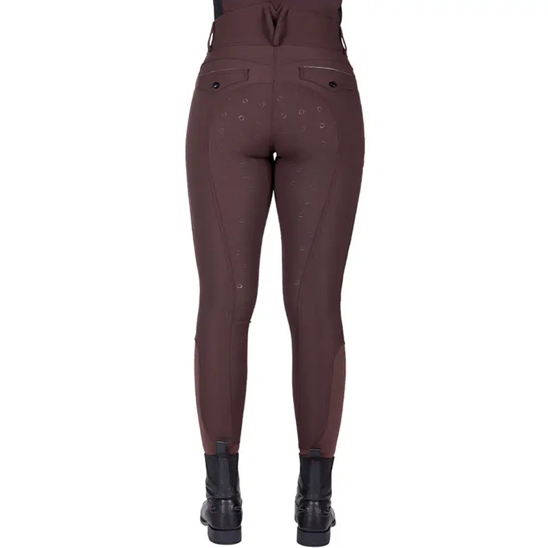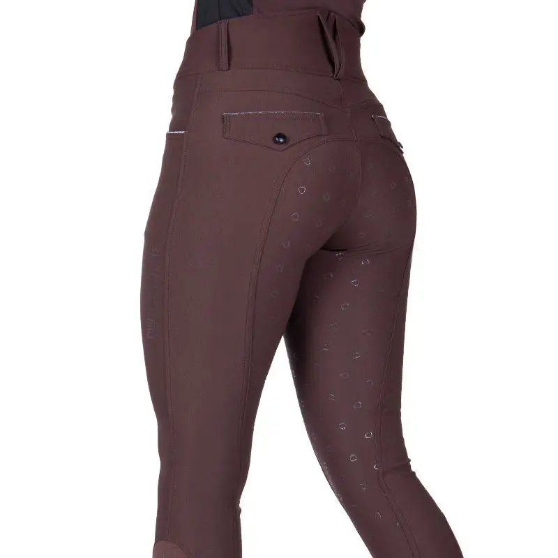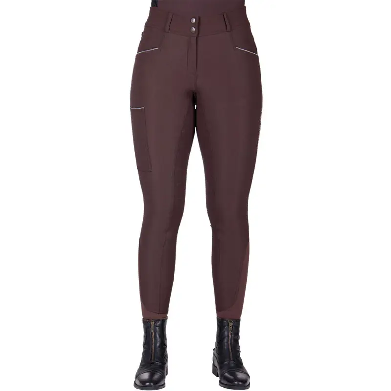 Damen-QHP-Reithose Julin Full Grip Coffee mit kontrastierenden Details und Nähten. Diese Reithose besteht aus einem farbechten, atmungsaktiven und feuchtigkeitsableitenden Stoff und verfügt außerdem über einen hohen Komfortbund in Kombination mit einer V-Form auf der Rückseite. Der griffige Sitz dieser Reithose ist aus Silikon im Steigbügelmodell gefertigt.