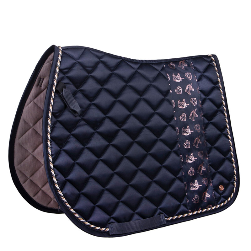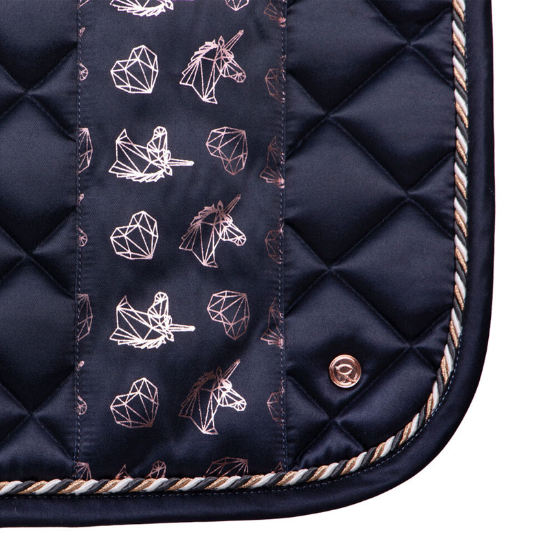 Die QHP Schabracke Didy grau ist eine schöne Unterlage für Kinder und ihr Pony. Die Decke ist mit einem Einhorn-Print versehen und am Rand mit einer zweifarbigen Zierkordel verziert.