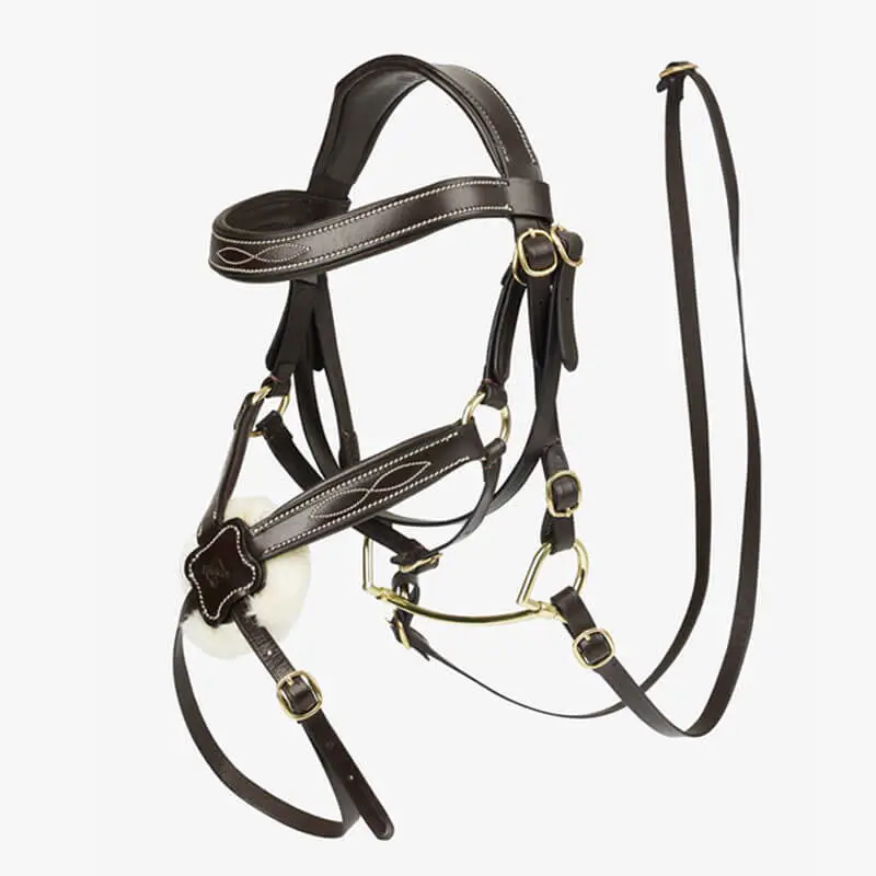Der Zaum ist mit Kontrastnähten versehen und hat ein Fell an der Nase. Das Zaumzeug wird in Kombination mit passenden Zügeln und Gebiss geliefert.